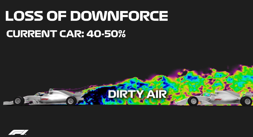La aerodinámica de estos nuevos monoplazas está pensada en los coches perseguidores, el diseño más suave y menos enredado, que en flujo de aire tomaria a lo largo del coche, ha dado como resultado una pérdida de carga aerodinámica, en la parte de salida trasera del coche de tan solo 10 %, comparado con la pérdida de carga en los monoplazas actuales que representa alrededor de un 40-50 %. Está pérdida se traduce en aire sucio que el coche perseguido va dejando por su paso en la pista, mientras que el coche perseguidor va tomando este aire sucio, poniéndolo en desvantaja durante la succión, ya que la carga aerodinámica producida en éste no es la misma que el coche que va por delante, poniéndolo en desventaja.