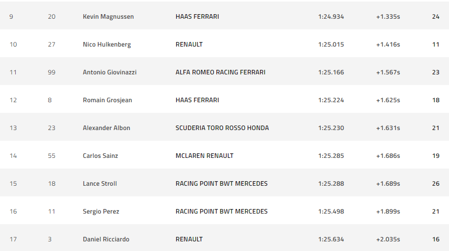 Se peleó el todo con el todo para la Q3, Hamilton marcando el tiempo más rápido durante el inicio de la Q3, pero Bottas logró bajarle el tiempo con 1:40.495 y con esto se lleva a la bolsa su octava pole en F1. Vettel termina en tercero y la sorpresa para México, Pérez termina quinto y arrancará en esta posición el día de mañana. Se espera una buena actuación del mexicano para este gran premio. Esperamos ver su tercer podio en Azerbaijan. El día de mañana a partir de las 6:00 a.m. hora local de México arrancará el Gran Premio de Azerbaijan. El standing de la sesión clasificatoria termina así:
