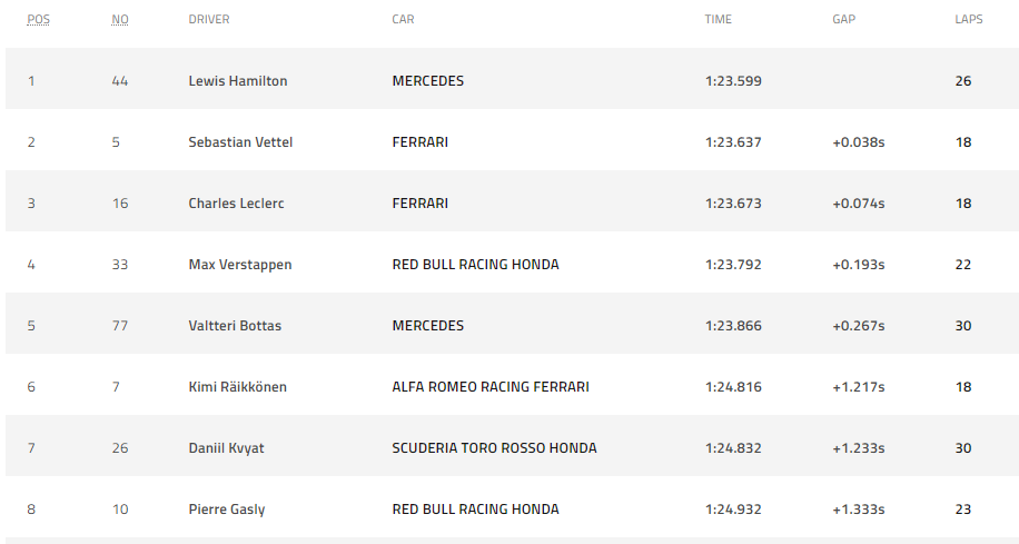 La primera sesión clasificatoria inició con Leclerc marcando tiempo más rápido, parando crono en 1:41 minutos, poco después el francés Gasley lograría desbancarlo mandándolo al segundo puesto, marcando un mejor tiempo de vuelta de 1:41.335.