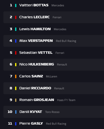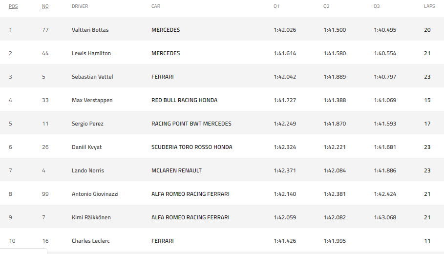 Se peleó el todo con el todo para la Q3, Hamilton marcando el tiempo más rápido durante el inicio de la Q3, pero Bottas logró bajarle el tiempo con 1:40.495 y con esto se lleva a la bolsa su octava pole en F1. Vettel termina en tercero y la sorpresa para México, Pérez termina quinto y arrancará en esta posición el día de mañana. Se espera una buena actuación del mexicano para este gran premio. Esperamos ver su tercer podio en Azerbaijan. El día de mañana a partir de las 6:00 a.m. hora local de México arrancará el Gran Premio de Azerbaijan. El standing de la sesión clasificatoria termina así: