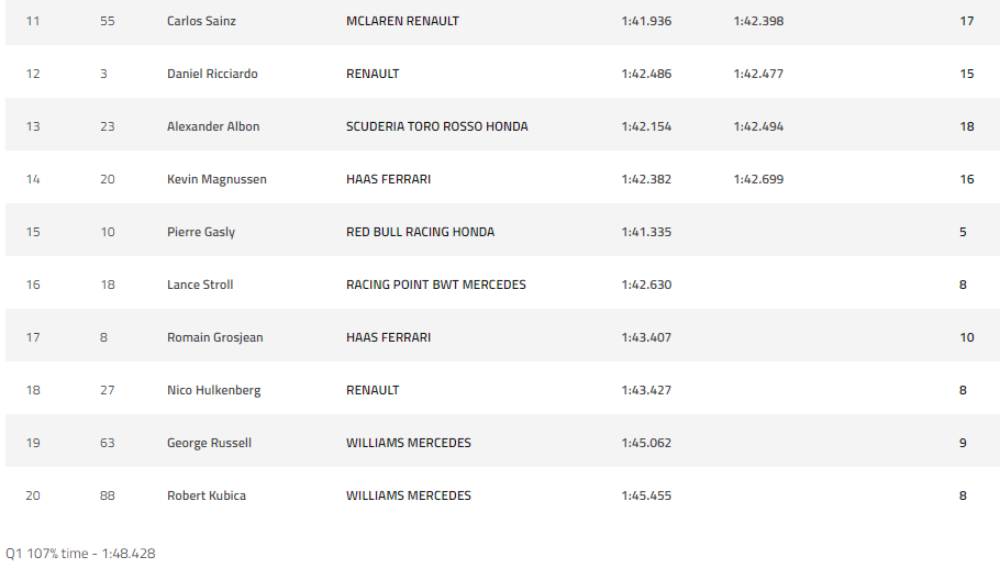 Al empezar la Q2, los tiempos de vuelta los lideraba Gasley con Leclerc por detrás, con Bottas colándose en el primer puesto momentáneamente, pero poco tiempo pasó para que el otro accidente en la misma curva se diera, ahora le tocaba a Leclerc acabar contra el muro de contención, lo que lo dejaba directamente fuera de la Q2. Era de esperarse la frustración del piloto tras haber tenido un grandioso fin de semana, ya que el día viernes su actuación fue buena y el día de hoy marcaba tiempos rápidos en la primera sesión de clasificación.